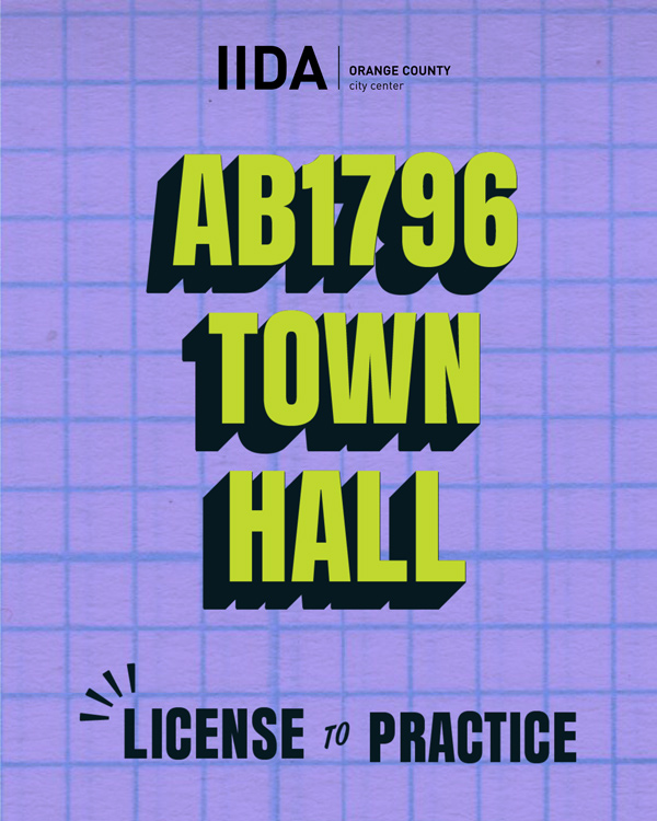 Orange County – next Wednesday 4/1, join IIDA SoCal’s Advocacy team at Gensler Newport Beach for our second AB1796 Town Hall. Ask questions, get involved, and raise a glass to licensure! This event is free and open to all – designers, architects, industry partners, and anyone else looking to better understand AB1796 and connect with their fellow advocates.
