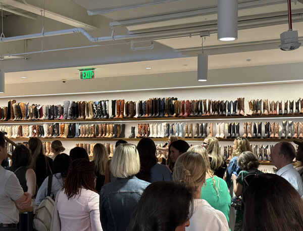 Our tour of Boot Barn Headquarters was an unforgettable experience that celebrated the brand’s western roots while showcasing cutting-edge workplace design. From the moment you set foot inside, it was clear this was not your average corporate office – it was a thoughtfully designed space that reflected culture, spirit, and nature. One of the standout moments was not only its 4- story high waterfall, but walking into a striking showroom lined wall-to-wall and floor-to-ceiling with hundreds of pairs of cowboy boots. The space detailed cozy lounge areas with unique furniture choices creating a quiet and relaxed space. Every detail throughout the tour reflected a deep commitment to authenticity, comfort, and brand alignment.